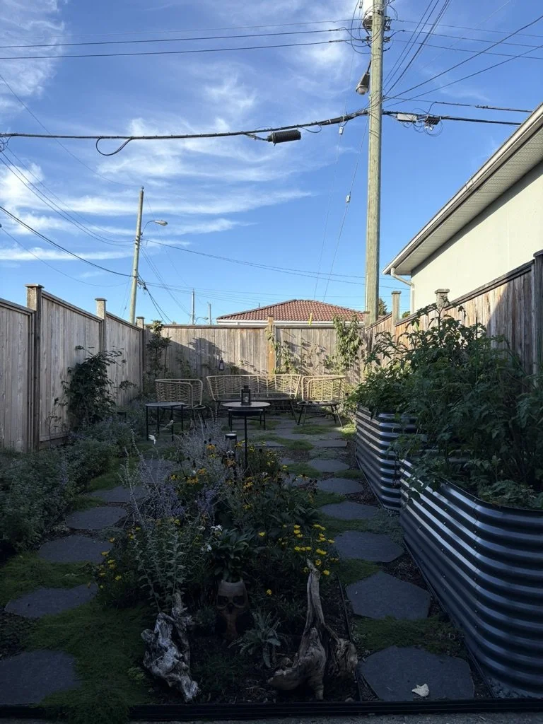 This is one of the largest projects we have done! This was a full scale re-do, with the aim of creating space for people, plants, and the local pollinators! Featuring 9 cedar raised garden beds built into the outer wall, planted with a mix of vegetables and herbs plus 3 semi-dwarf varieties of fruit trees! There are two mounded beds created near the house that are planted with native edible and medicinal shrubs and perennials like echinacea, rudbeckia, choke berry, salmon berry, honeyberry, thornless blackberry, and more! Two metal planters were installed in the back yard, and the the whole property got covered in mulch for low maintenance. All the beds and planters had drip irrigation systems installed for easy watering.
