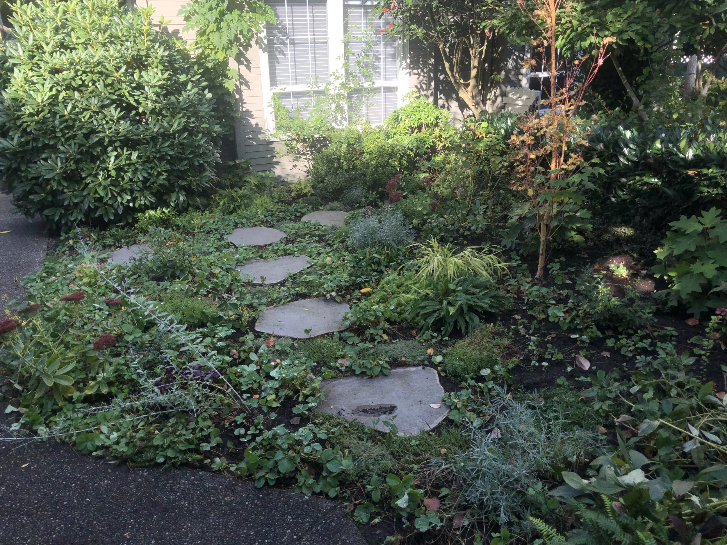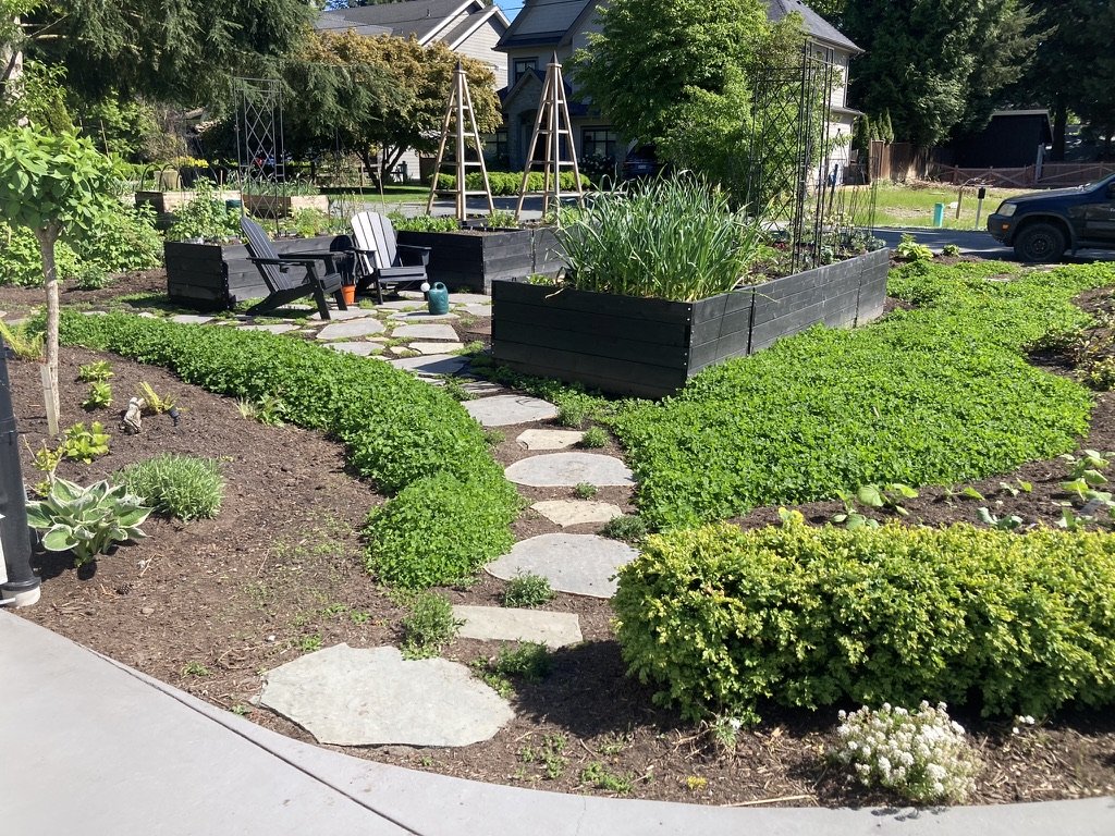 This project was a full scale front yard redo, turning what was previously a grass lawn, into a gorgeous permaculture style food garden! Featuring multiple fruit trees (semi dwarf varieties of apple, cherry, persimmon, and fig), native edible shrubs (gooseberry, salmonberry, and serviceberry) and also blueberries, raspberries, plus perennial crops like asparagus. Native shrubs helping to promote our local wildlife were planted, including but not limited to pacific nine bark, red osier dogwood, multiple coneflowers, bleeding heart, and columbine. We also installed a cedar garden bed sealed with tung oil for safe food production. We can’t wait to see how this food garden establishes!