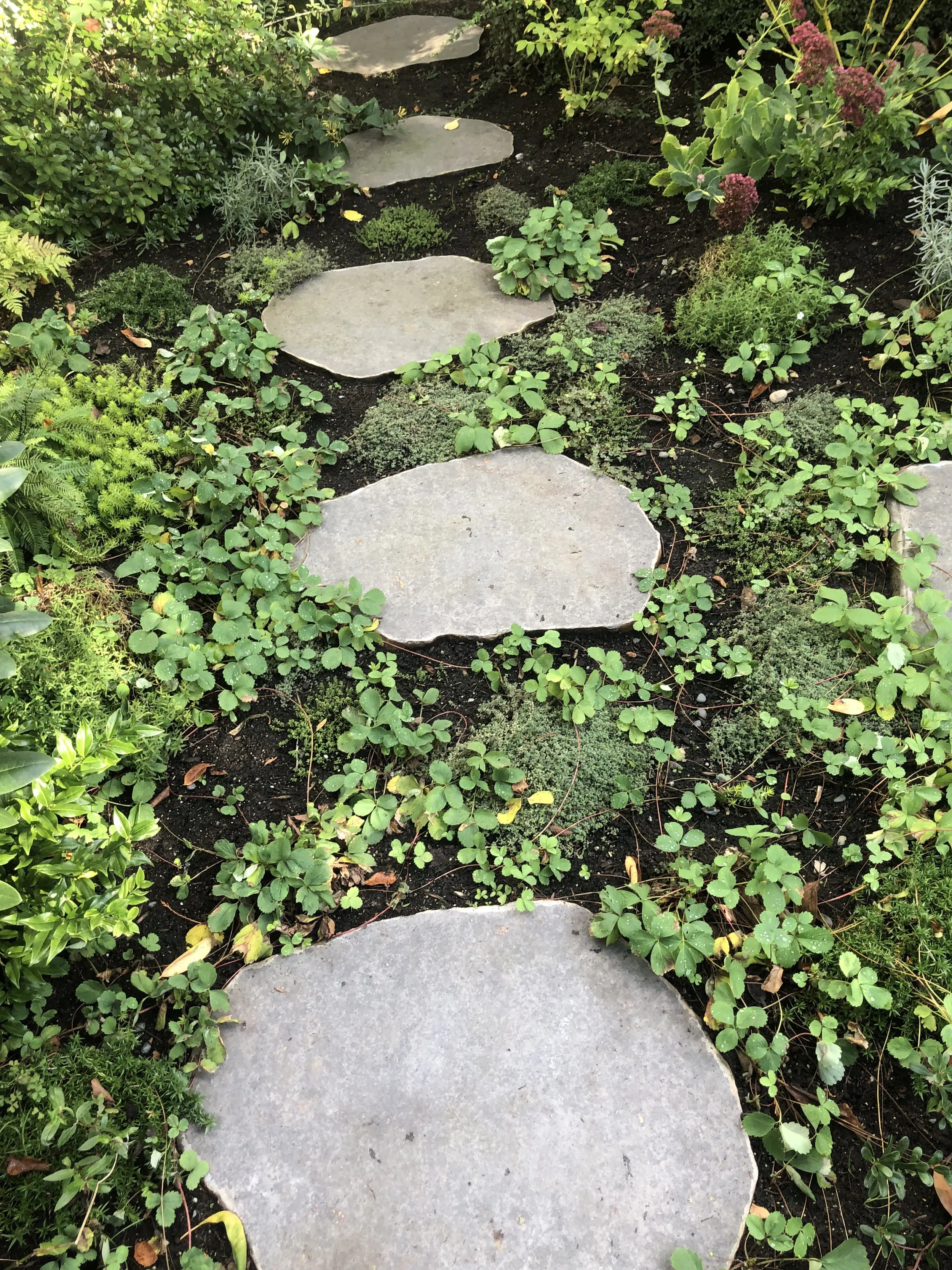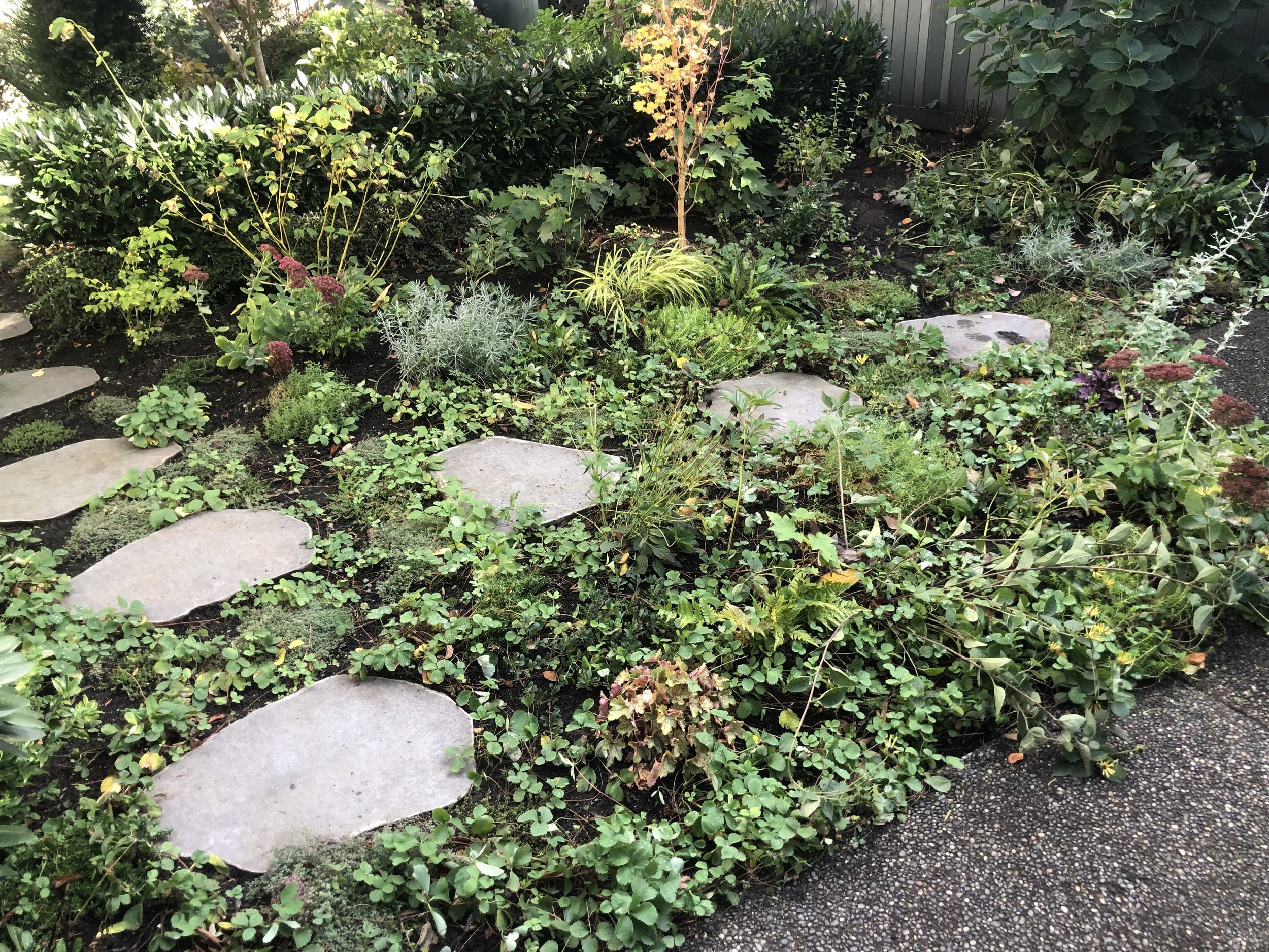 This backyard redo utilizes what was previously a lawn, and created a brand new clover lawn, and two new mounded garden beds that are pollinator friendly, productive for the clients, and aesthetically pleasing.