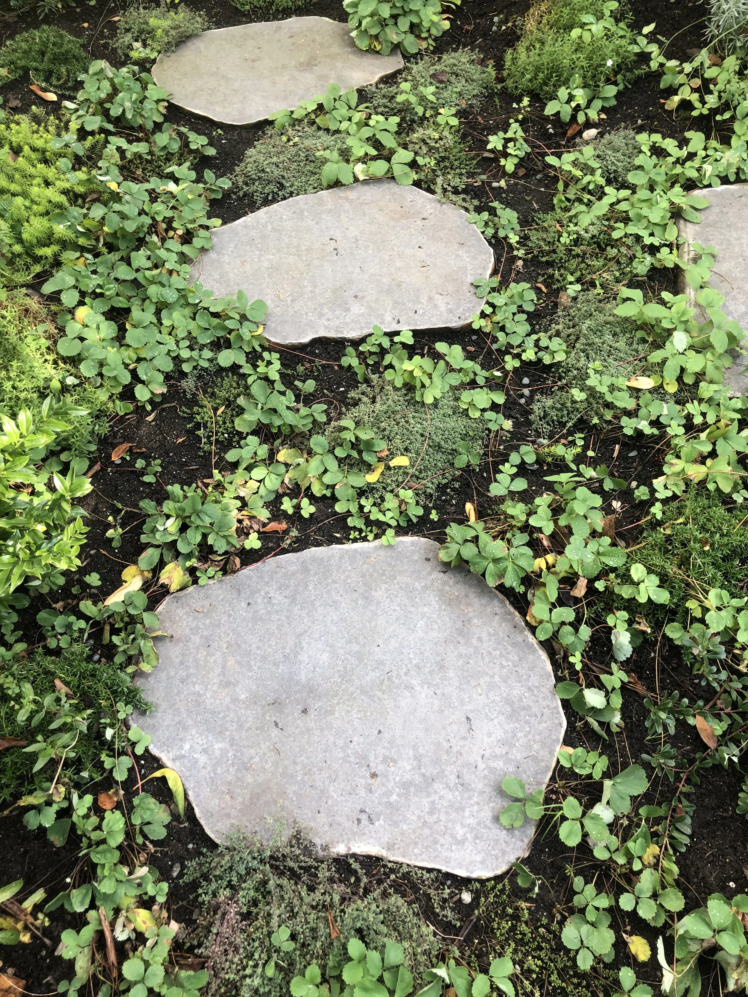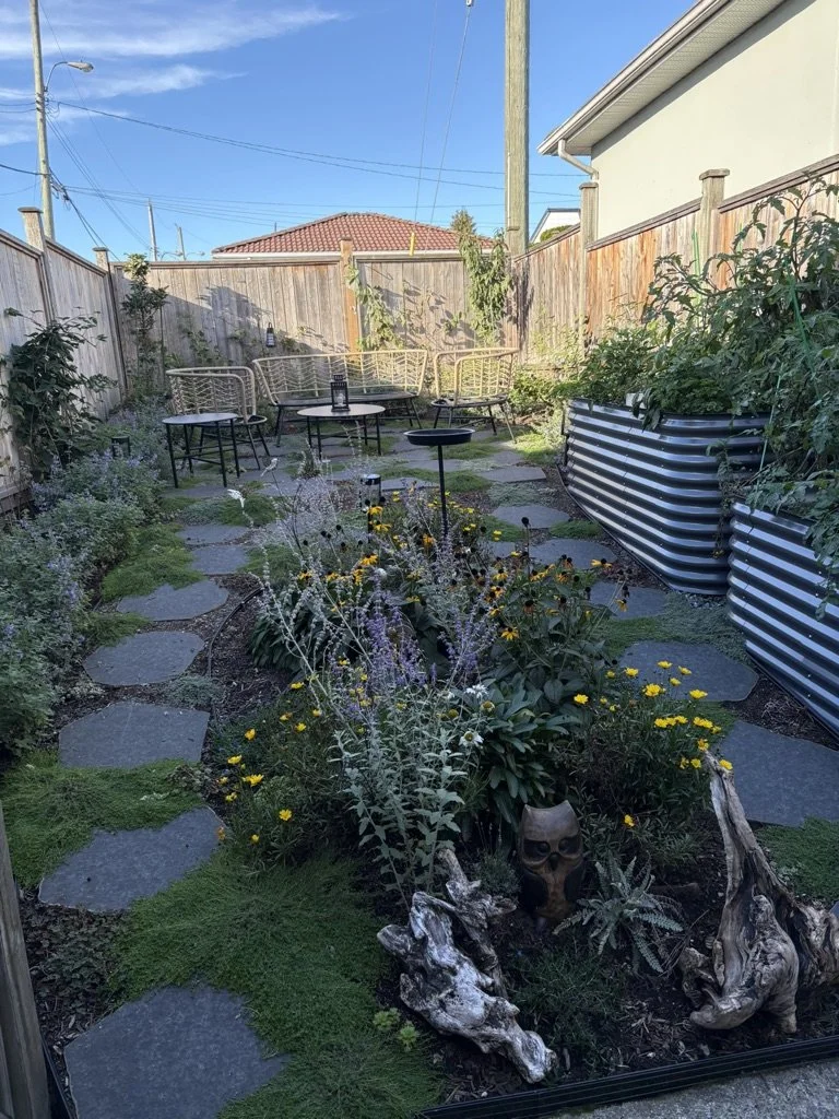 We also installed a basalt pathway with creeping star jasmine and creeping thyme for easy access and gorgeous appeal to the vegetable garden space. The galvanized planters feature tomatoes, mixed cucurbits, beans, peas, mixed leafy greens, and more, along side our favourite companions (marigolds, calendula, alyssum, and nasturtiums).