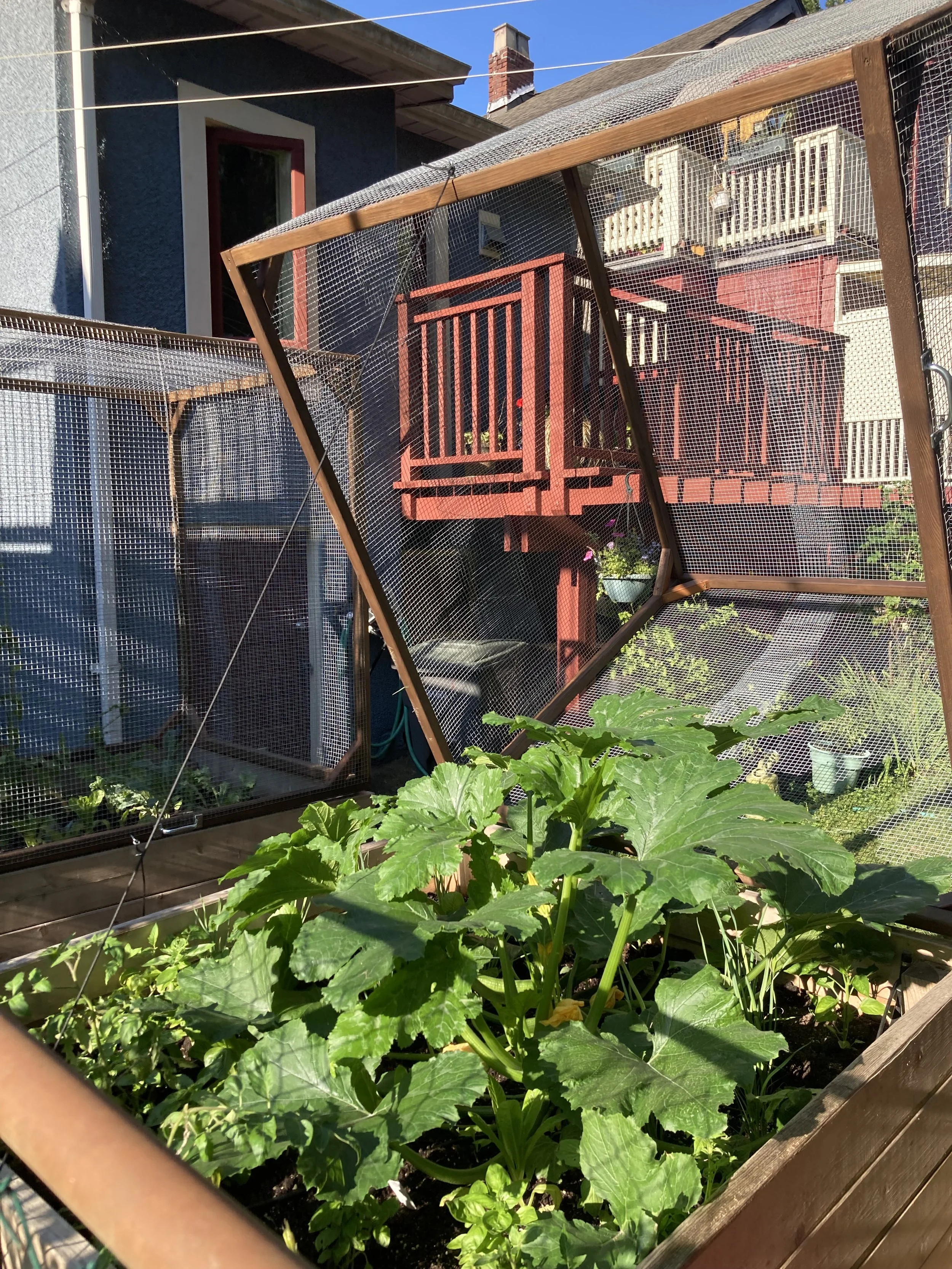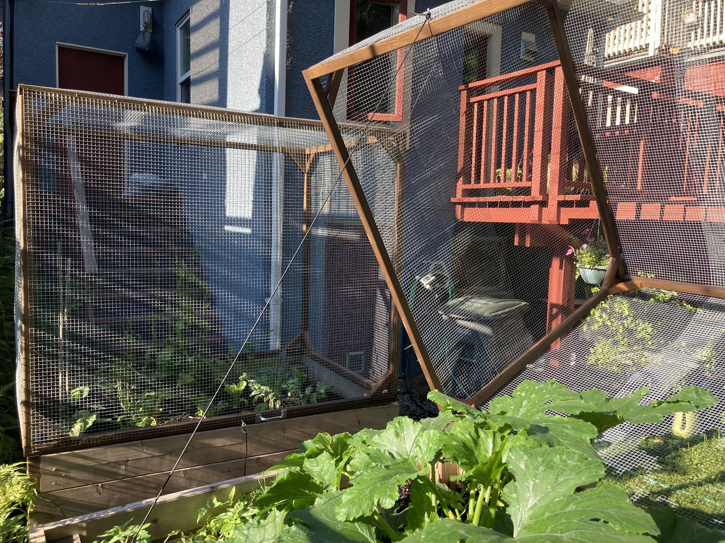 This project featured 2 large enclosures, built using 2”x 2” cedar, stained with a water based brown stain. These enclosures are to help minimize rodent damage, and keep out certain larger insect pests. They were retrofitted onto our clients existing planters (not built by us). The enclosures have hinges and handles to lift easily off when access is needed.